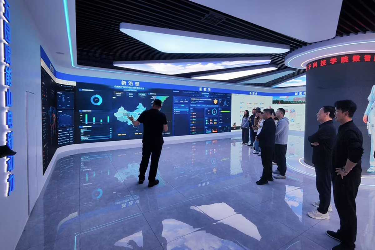 本次开放的数智展厅以新空间、新教学、新服务、新治理、新素质为主题,深度整合大数据、物联网、AI 交互等前沿技术,集中展示学校数据可视化驾驶舱等核心应用场景。通过实景演示,全面呈现学校“一网通办、一屏统管、全域智慧”的智慧校园建设成果,让师生直观了解数字技术在教学、管理、服务、治理等校园全场景的落地应用。